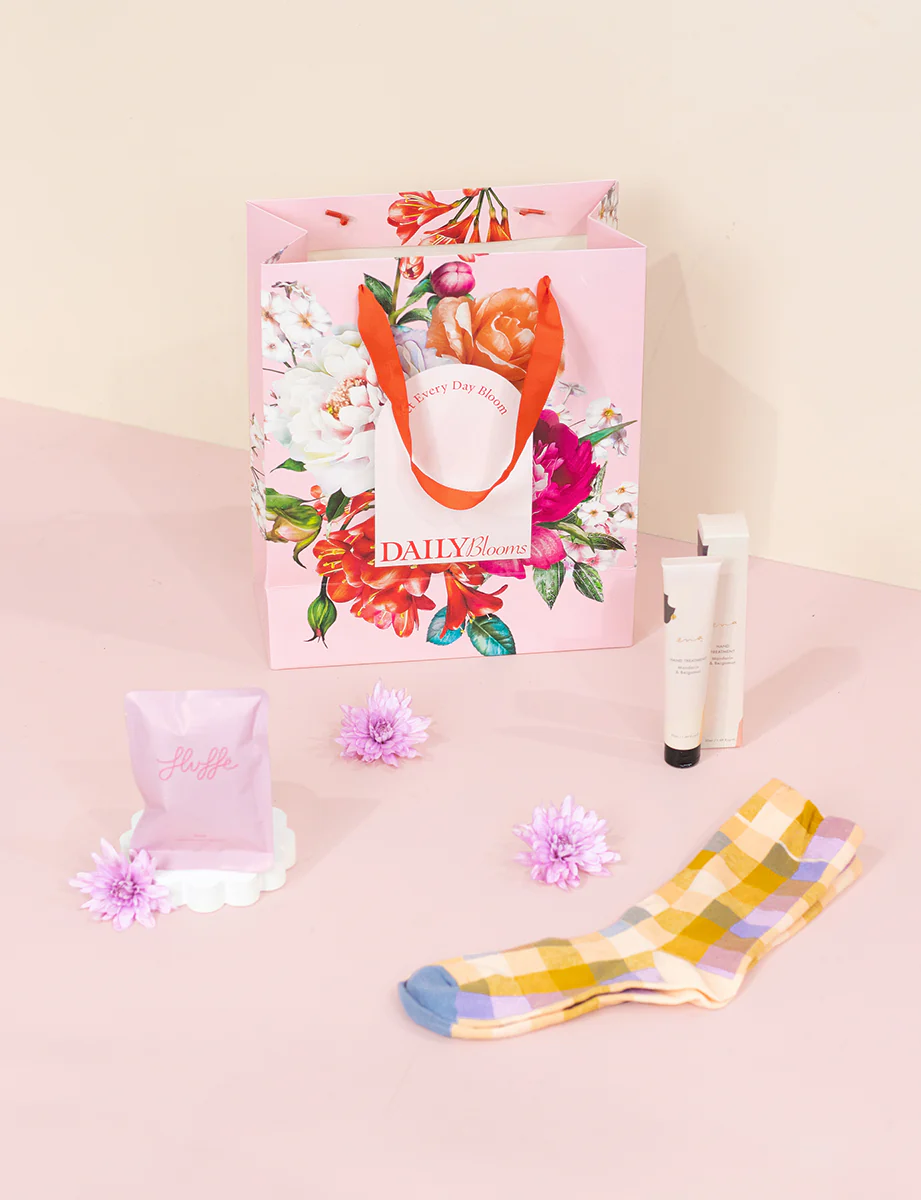 Our BFF Bundle is a cheerful mix of comfort and care, featuring a vibrant bouquet of fresh blooms, a cosy pair of Tootsie Checkered Socks, nourishing Ena Mandarin & Bergamot Hand Cream, and a sweet surprise with Fluffe Cotton Candy in Rose or Ribbon (baby pink swirls of nostalgic vanilla).