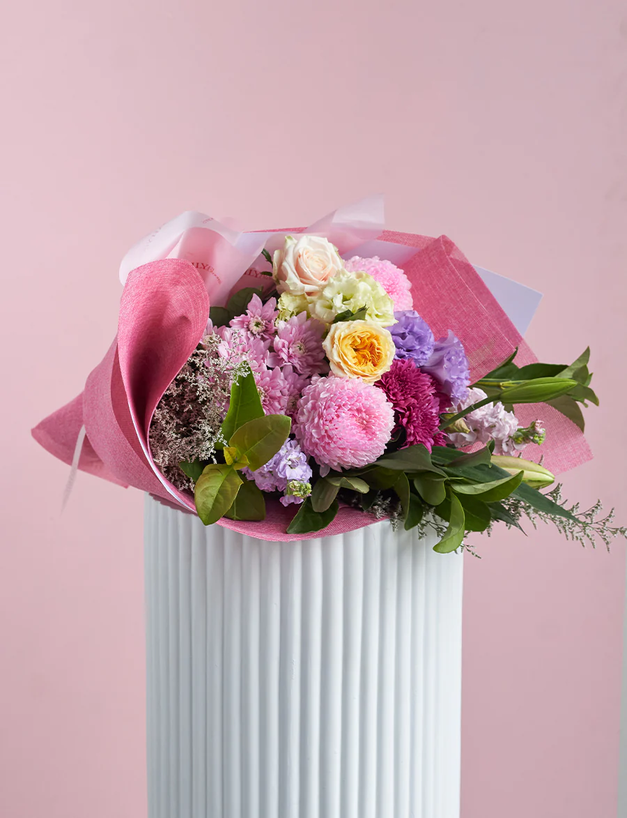 Each Radiant Luxe bouquet is thoughtfully wrapped in pink hessian, layered with premium paper and Daily Blooms tissue, tied with ribbon, and includes a gift card for your personal message.